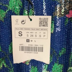 Zara blue floral print sequin top with short sleeves and raw hem. NWT