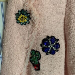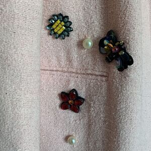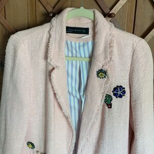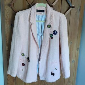 Zara pink tweed blazer with frayed hemline and lapels. Has beads, rhinestones and sequins floral and butterflies embellishments on front with pearls. Blue/white ticking striped contrast lining. Excellent condition.