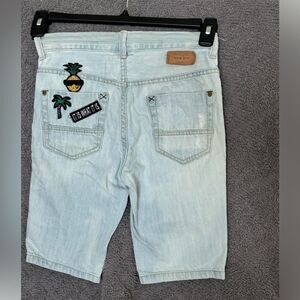Zara boys denim shorts with patches and rips with tie and button waist sz8