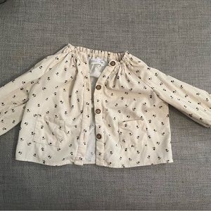 Shirt size 18-24 months but bigger (I would say 2-3 years), top 2-3 years.