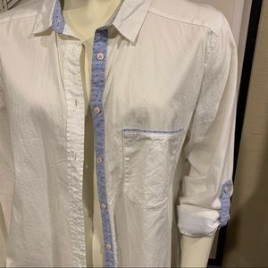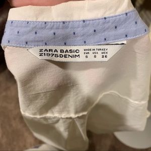 Zara button down with blue polka dot trim. Size small. Adjustable sleeve (see photos). Good condition.