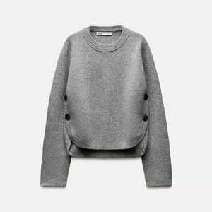 Grey sweater with side buttons and curved hem in like new condition. This runs very small. Size tag says L but I am listing as S/M for accurate fit. (Has never been washed so not shrunken, in original condition).