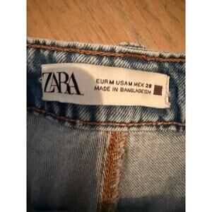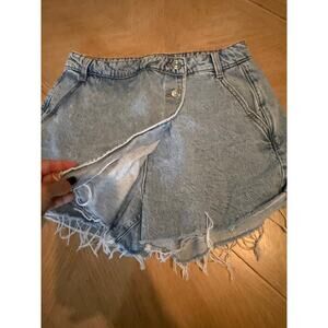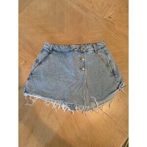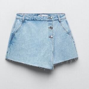Fun & chic light blue denim skort with buttoned wrap details. Front zip & button closure. Unfinished hem.