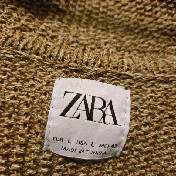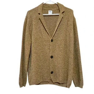 This Zara cardigan has a classic and cozy style, characterized by its textured, woven fabric that features a warm, earthy brown tone. It has a relaxed fit with a button-down front, and the collar adds a touch of sophistication. The design is versatile, making it suitable for both casual and slightly dressier occasions. The simplicity of the style allows it to be easily layered over various outfits.