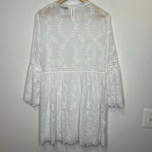 In excellent condition! Dress it with a tank or slip. From armpit to armpit is about 19 inches and 36 inches long. Beautiful eyelet lace dress with bell sleeves. All items have been cleaned and comes from a smoke free home.