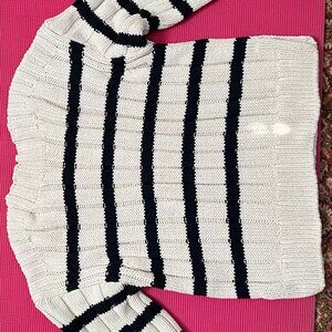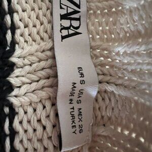 Zara rib-knit sweater, boatneck, long sleeves, cream with black stripes, size S, 45% cotton, 55% polyester, chunky knit, length from top of shoulder to hem approx. 22 inches., hardly worn, excellent condition.