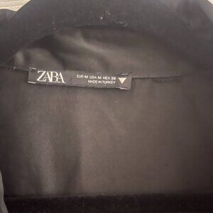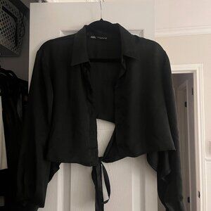 The blouse is black and made from a lightweight, likely satin or similar smooth fabric. It features a button-down front with a tie detail at the hem, a collar, and long sleeves. The style is often described as versatile and can be worn for various occasions. size m perfect conditions