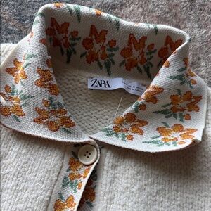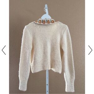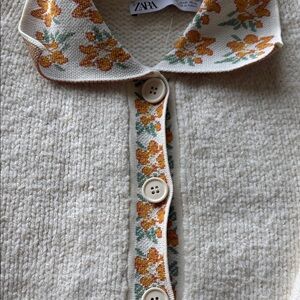 Chic cream cardigan featuring floral accents. Stylish button-up design.