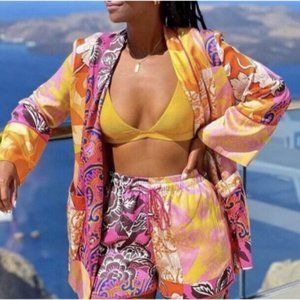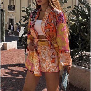 Zara color block belted kimono jacket with pockets silky polyester orange purple