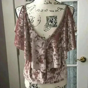 Pinky/ mocha colored velvet top. Wrap around ribbon belt, front and back ruffle. NWT from a fast shipper.