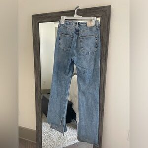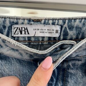 Elevate your denim game with these trendy Zara distressed relaxed flare jeans in a size 4. These jeans feature a flattering relaxed fit with a stylish flare leg that adds a touch of retro flair to any outfit. The distressed detailing gives these jeans a cool, lived-in look that is perfect for casual weekends or nights out with friends. Made from high-quality denim, these jeans are designed to last and will quickly become a staple in your wardrobe. Pair them with a simple tee and sneakers for a laid-back look, or dress them up with heels and a blouse for a more polished ensemble. Don't miss out on adding these versatile and on-trend jeans to your closet today!