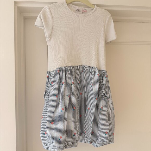 Zara dress size: 6yr color: white, bottom skirt is blue stripes with pink flowers short sleeves, has pockets