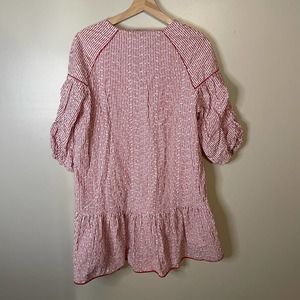 Style: red and white seer sucker striped embroidered midi dress with a V neck and puff half sleeves, bottom ruffle detail, eyelets