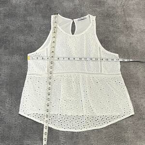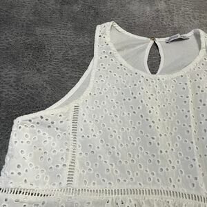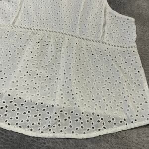 - All white shirt, eyelet design throughout the whole top with small stripe designs on the front and a solid area at the back