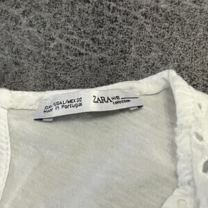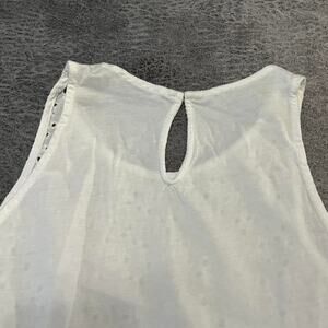 - All white shirt, eyelet design throughout the whole top with small stripe designs on the front and a solid area at the back