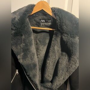 In great condition, looks new, warm and stylish coat, 2 front zipper pockets, zipper closure. Entire coat is lined with soft grey faux fur. Coat has a soft exterior fabric similar to suede .