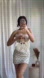 Half-moon shaped bag with faux mother-of-pearl appliqués. Double circular top handles and a removable chain crossbody strap. Lined interior with one pocket. Magnetic closure.