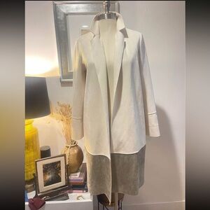 Zara faux suede ivory/taupe color block long line jacket/coat size Small has pockets.Like new- no flaws super soft.