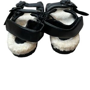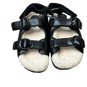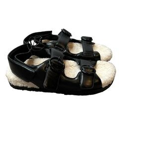 Step into cozy style with these Zara black faux leather sandals featuring oversized buckle straps and plush faux shearling footbeds. These statement sandals combine comfort and trend, perfect for transitional weather or laidback luxe looks.