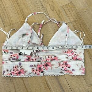 Short top with V-neckline and thin, adjustable cross-back tie straps. Tonal trimming appliqués.