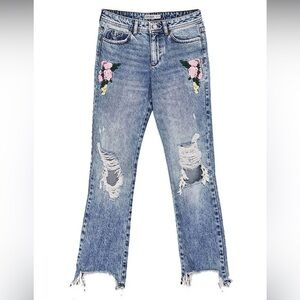 Zara floral embroidered distressed raw hem cropped ankle flares. Size 4