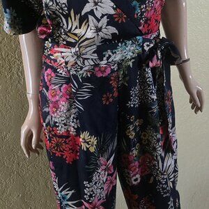 Zara floral jumpsuit, size large. Vibrant flowers imprinted on dark navy blue background. The jumpsuit has straight legs, a cross-over front with a pleated band attached at the waist. There is a standup collar, and wide front lapels. The closure is at the left side with a short zipper and one button. Runs small.