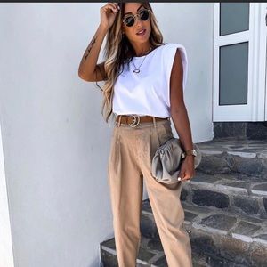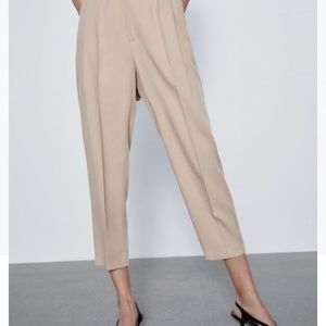 High waist pants with elastic waistband at back .Front pockets and back buttoned welt pockets front zip metal hook and inside button closure.