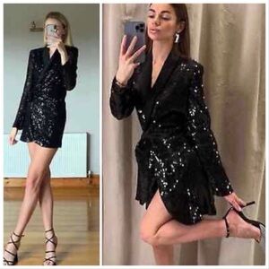 MINI DRESS WITH LAPEL COLLAR IN TONAL MATCHING FABRIC. LONG SLEEVES. SEQUIN APPLIQUÉ. FRONT WRAP CLOSURE WITH SELF TIE.