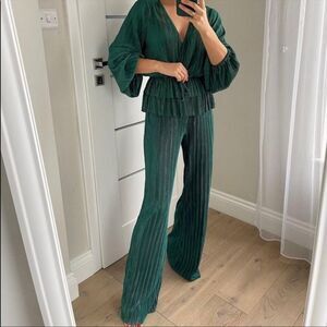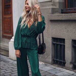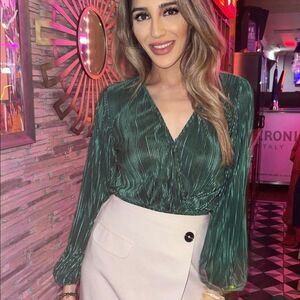 Blouse with surplice V-neckline and long sleeves with elastic cuffs. Pleated fabric. Adjustable self-drawstring waist
