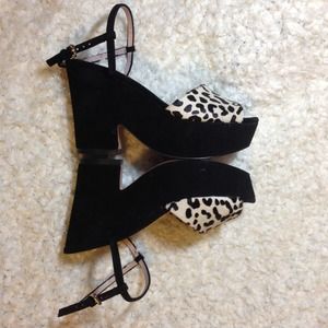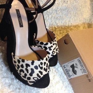 Fur and leopard prints on upper strap, thin ankle straps with buckles, platform heels. No tags, with box, never worn outside.