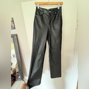 Super cute faux leather pants these have a high rise with straight leg. There is some stretch to them. Waist measures at a 25 and the length is a 31. Worn once.