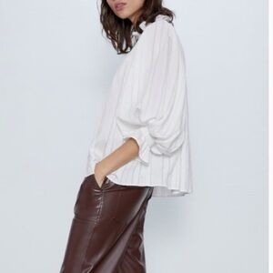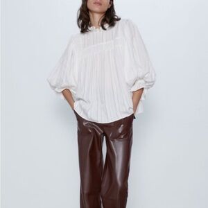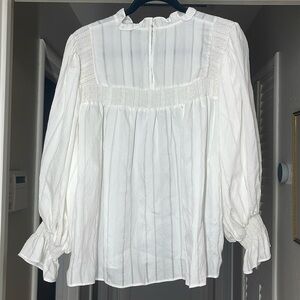 Winter white with contrasting elastic detail and ruffled trim. Hidden back button. Elastic sleeves. Comfortable and roomy. A couple of faint spots, didn’t try and remove, see last pic.