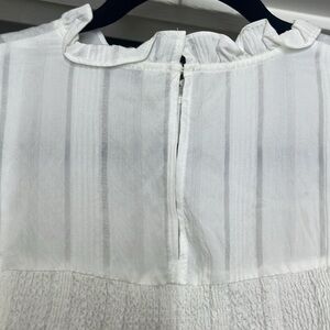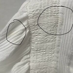 Winter white with contrasting elastic detail and ruffled trim. Hidden back button. Elastic sleeves. Comfortable and roomy. A couple of faint spots, didn’t try and remove, see last pic.