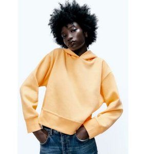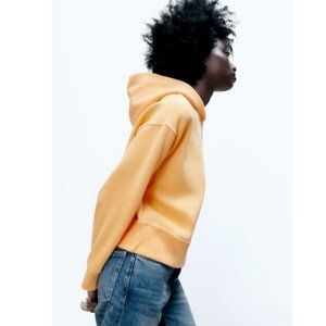 New with tag. Oversized and cropped. In beautiful sunny orange/yellow color. Hood and long sleeves. Rib trim. Cozy cotton blend material.