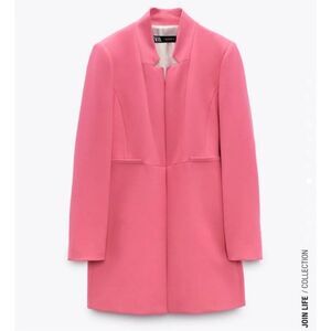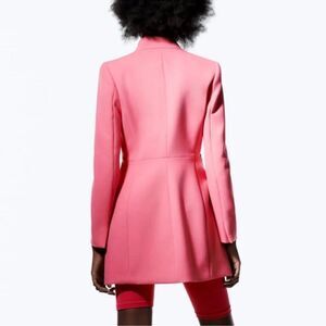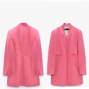 Zara pink inverted lapel long blazer size XS. Step out in style with this elegant pink blazer coat. Perfect for any occasion, it offers a chic and sophisticated look. Fully lined. Padded shoulders. Fitted waist. Interior hook closure. Measurements 16"pit to pit 31" length. Excellent condition except for a very mild stain near on one shoulder. Please see picture
