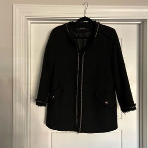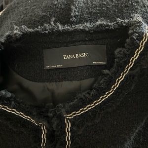 Zara jacket. Size large. Gently worn in good condition. Super cute jacket for dressing up in the fall and winter. Gold detail trim. Loop closure fasten detail closes the jacket.