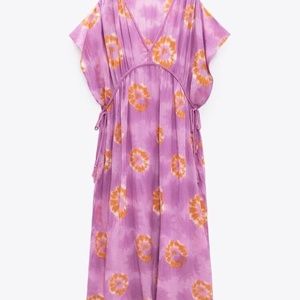 Size xs-s Kaftan dress with V-neck and short sleeves. Adjustable woven finish with side ties. Matching interior lining. Perfect for a vacation Would make a great beach coverup OUTER SHELL BODY 100% cotton ORNAMENTAL YARNS 100% polyester LINING 100% cotton
