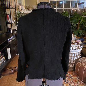 This jacket has an open front and zipper pocket detail. It is in excellent condition and perfect to throw over any outfit! You can easily dress this up or down. The hem is unfinished all around, but it doesn't fray.
