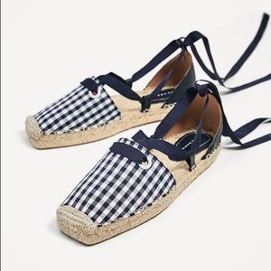 Zara lace up espadrilles navy blue checked print