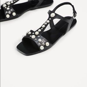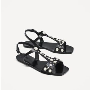 Zara leather flats sandals w/ faux pearl & studs NWT