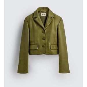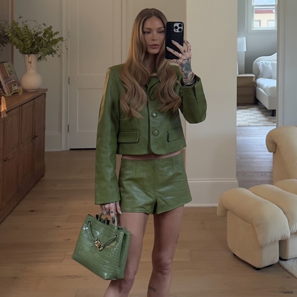 Green Zara leather jacket and short set. Sold out. Jacket is size small and shorts are size XS.