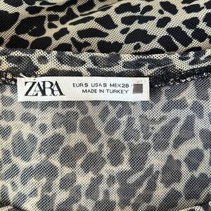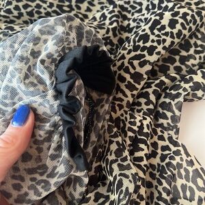 Zara Leopard Animal Print Tulle Tiered Dress with a sheer bodice, short sleeves, and a tiered ruffle skirt.