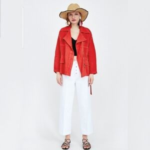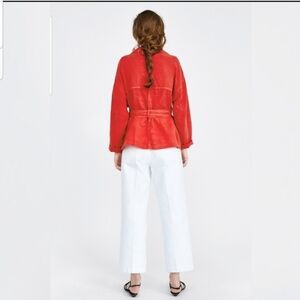 Linen jacket with lapel collar and long rolled-up sleeves. Features front flap pockets, crossover metal zip fastening in the front and a tied belt around the waist