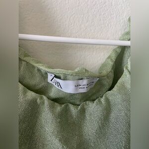 Elevate your wardrobe with this stunning lime green sequin off the shoulder ruffle blouse from Zara. This eye-catching top is perfect for adding a pop of color and sparkle to any outfit. The off the shoulder design and ruffle detail give it a feminine and trendy touch, while the sequins add a touch of glamour. This blouse is in a size Medium, making it a versatile piece for various occasions.Made by Zara, a trusted and popular fashion brand, this blouse is of high quality and sure to make a statement. The bright lime green color is perfect for spring and summer, and the sequins add a touch of elegance that is perfect for dressing up any look. Pair this blouse with jeans for a casual yet stylish look, or dress it up with a skirt and heels for a night out. Don't miss out on adding this unique and stylish piece to your wardrobe!