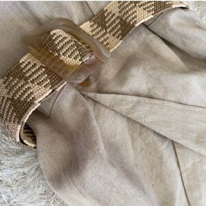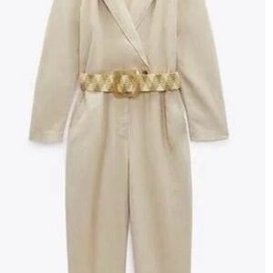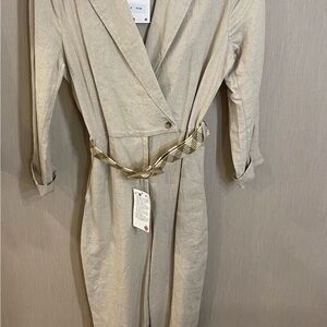 Brand new with tags. Ready to wear super cute linen blend jumpsuit. Material made of a linen and viscose blend. Johnny collar and long sleeves with shoulder tabs. Front pockets. Buckled belt included.