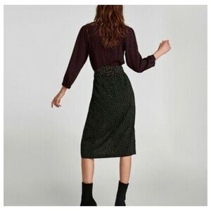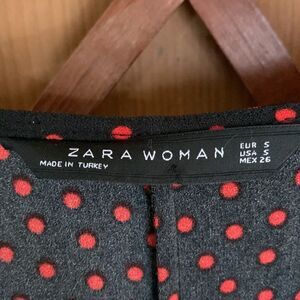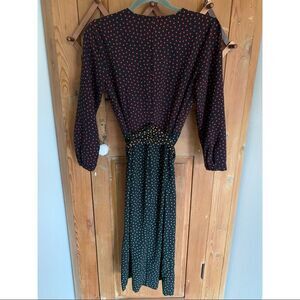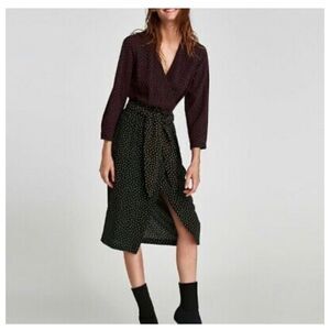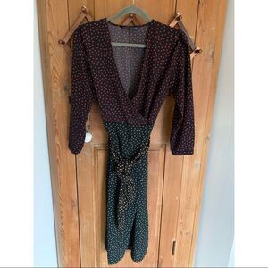 Zara wrap dress with red/green/yellow polka dot color block and sewn in long belted waist. Has V neck and button closure at waist. Long sleeves and buttoned cuffs. NWOT