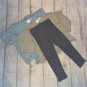 Set of four tops and one pair of pants from Zara. All size 3-4. Tan shirt has a few faint marks on front. Pants have slight fading on knees (please see pics). Otherwise, excellent condition.