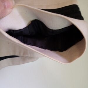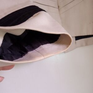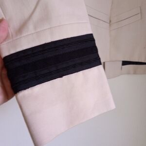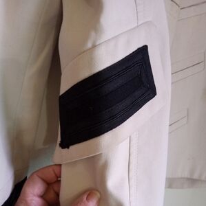 Gorgeous Zara Woman mandarin style tuxedo jacket. Khaki colored jacket, with weight to it, mandarin style collar, hook closure and black tuxedo detail. Great pre-owned condition with tiny marks from being stored and is dingy from being hung. I don't wash dry clean articles because I don't want to damage them. This should come out with stain remover and dry cleaning.