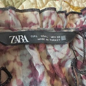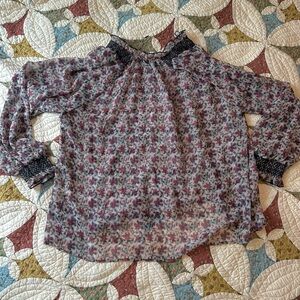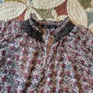 Zara maroon and cream floral sheer blouse with smocked collar and sleeves. Has puff sleeves, and is button up. Stylish floral blouse with smocked neckline and cuffs. Lightweight and comfortable.