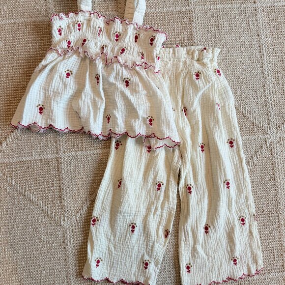 Gauzy fabric embroidered with red floral patter. thin strap top with pants that have a scalloped edge